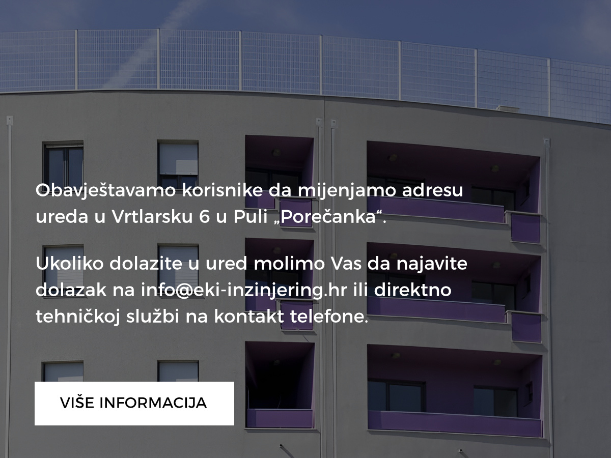 Ukoliko dolazite u ured molimo Vas da najavite dolazak na info@eki-inzinjering.hr ili direktno tehničkoj službi na mob. kako bi izbjegli duža čekanja ili da Vas šaljemo na drugu lokaciju.